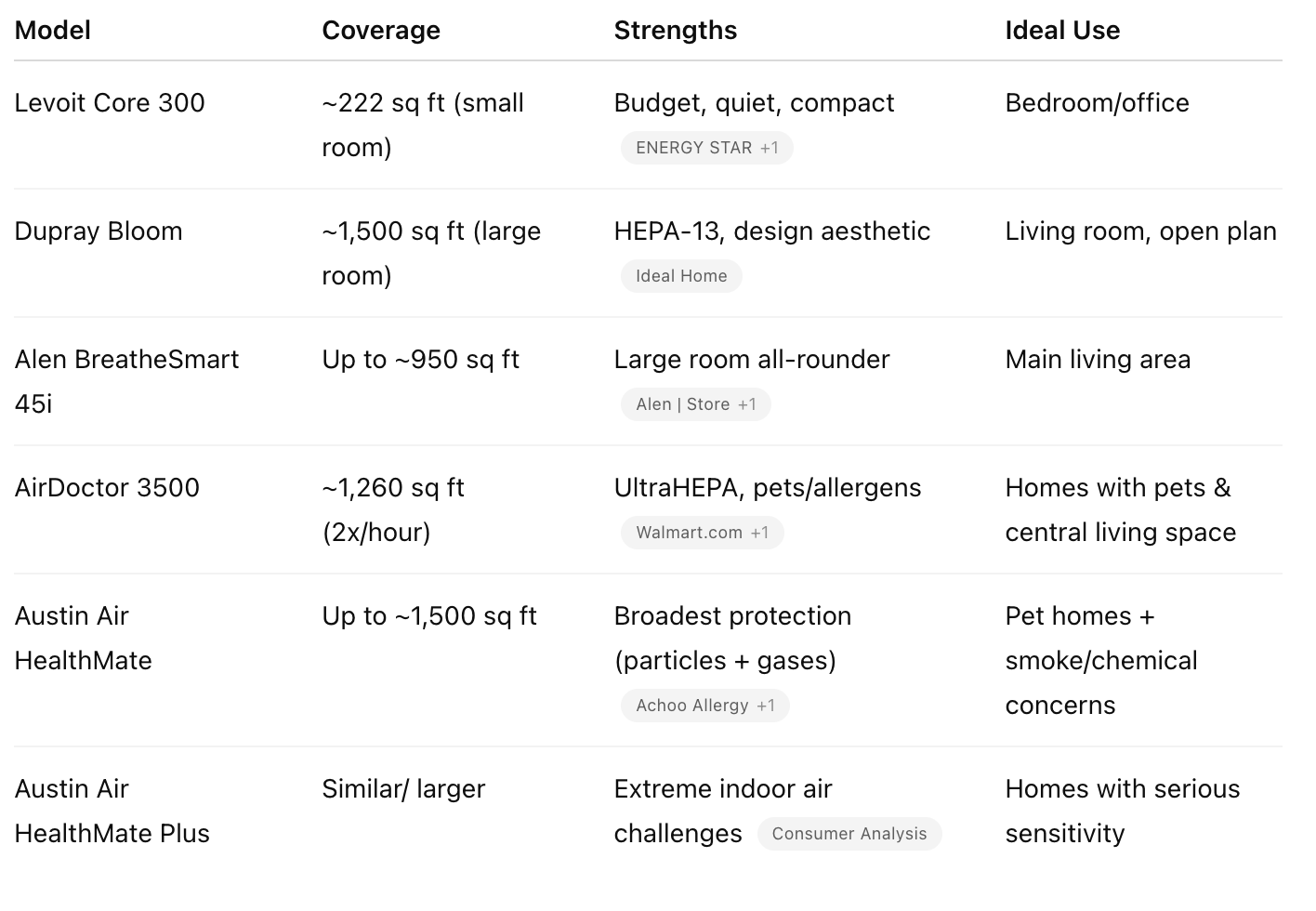 • Austin Air HealthMate: True HEPA filtration rated to remove 99.97% of particles 0.3 microns+ and also targets gases/VOCs — very robust for heavy-duty needs like pet heavy homes, wildfire smoke, or chemical sensitivity. Achoo Allergy+1 Coverage up to approx 1,500 sq ft when running on high.
